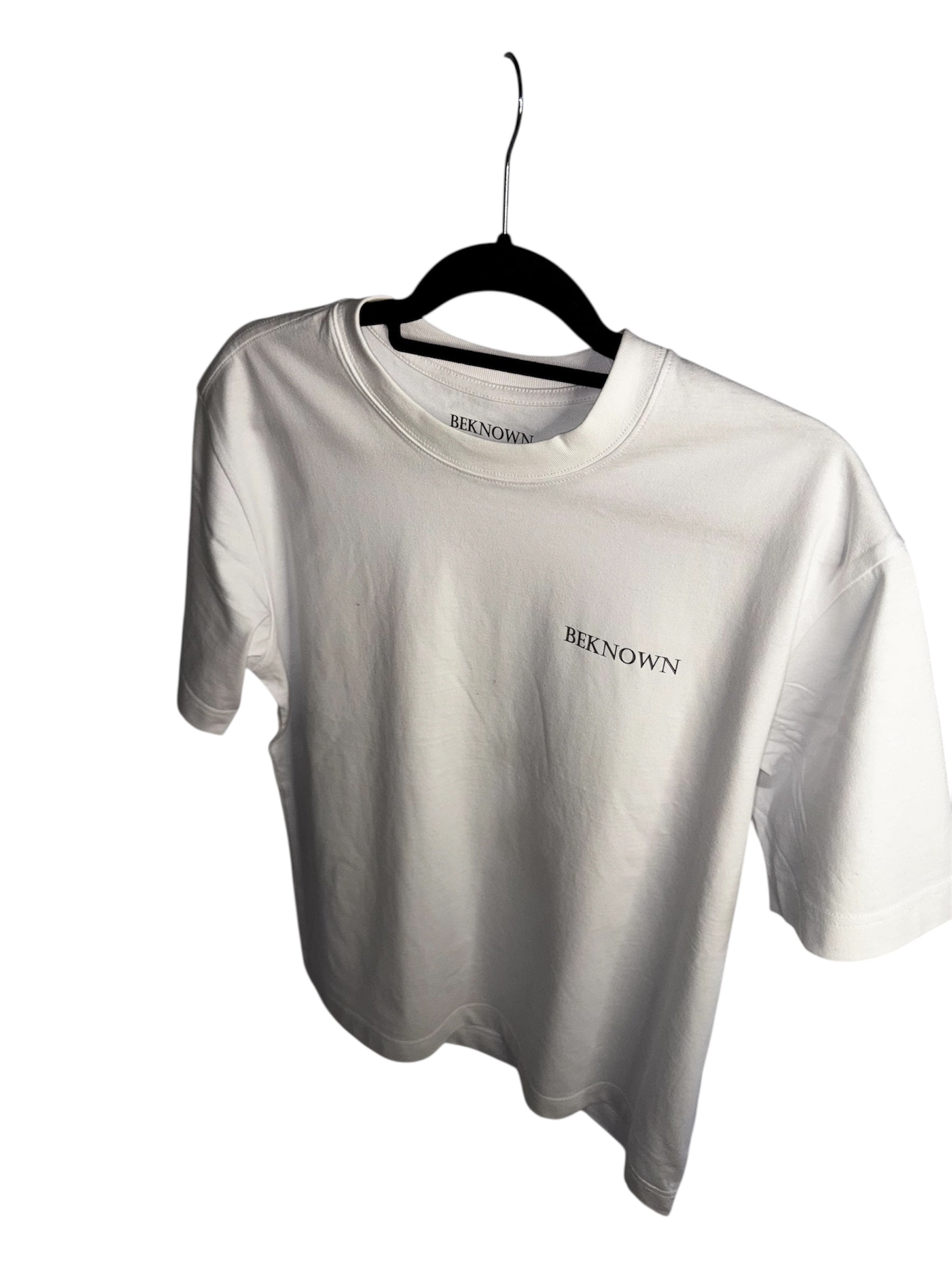 Brede halsrib met dubbele stiksels, verlaagde schouders, korter model, verstevigde schoudernaden (shoulder-to-shoulder tape), dubbele zoomstiksels, voorgekrompen om krimp te minimaliseren